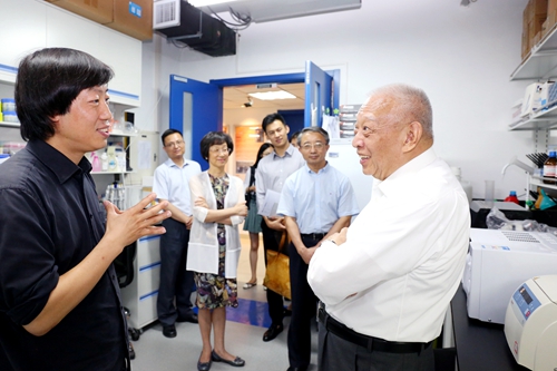 BioPic中心副主任汤富酬教授向董建华介绍研究情况课程交流结束后,董建华还到综合科研楼参观了北京大学生物动态光学成像中心(BioPic)。BioPic中心副主任汤富酬教授向董建华介绍单分子技术手段、高通量测序技术为生物医学研究带来的革命性变化,生物动态光学成像中心正是利用最先进的生物成像技术和基因测序手段,在分子和细胞水平上进行生命科学与医学基础研究。董建华对于癌症、衰老等医学问题表示重大关切,询问了这些技术在医疗健康领域的应用,并对未来香港和内地的医疗合作表示期待。