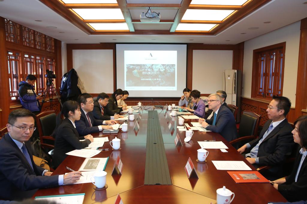 2019年1月8日,瑞士德科集团全球首席执行官艾伦·德阿茨(Alain Dehaze),外企集团董事长王一谔、总经理霍连明一行访问北京大学。校党委书记、校务委员会主任邱水平,校党委常委、副校长陈宝剑等在临湖轩会见来宾。