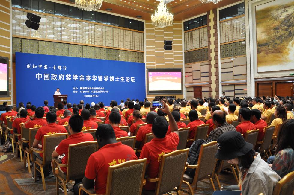 2019年6月14日下午,由国家留学基金管理委员会主办,北京大学、北京航天航空大学承办的“感知中国•首都行——中国政府奖学金来华留学博士生论坛”在北京大学英杰交流中心举行。论坛邀请了来自全国十所高校的优秀留学生博士生代表汇报来华留学成果,来自全国14个省市40所高校的200多名中国政府奖学金来华留学博士生代表参加此次活动。北京大学副校长陈宝剑、国家留学基金委秘书长生建学出席论坛并致辞。论坛由北京大学国际合作部部长夏红卫主持。