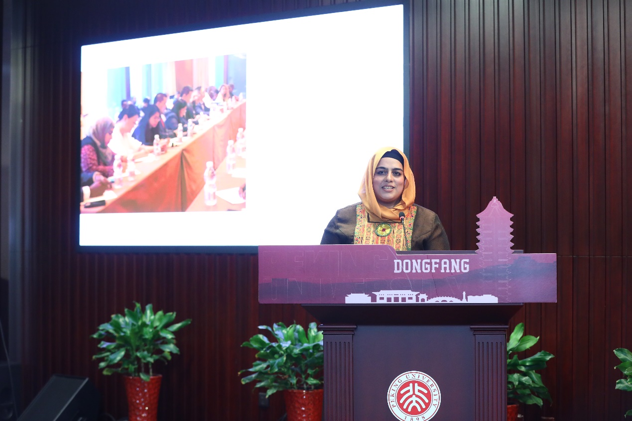 来自阿富汗的Nasria Pashtun代表全体学员致辞。她表示,与来自32个国家的学员一起参加东方奖学金项目在北大学习,是一生难得的机会。中国也曾饱经沧桑和动乱,但是有了中国共产党的坚强领导,中国人民万众一心,今天的中国已经成为世界第二大经济体,而且从未停止发展的脚步。许多学者持西方意识形态,未能正确认识到中国及其取得的发展成就。中国是独特的,中国各个行业的发展也是独特的——这就是中国特色。这条路难以照搬,但可以借鉴。Nasria Pashtun的发言得到现场学员的肯定和热烈呼应。
