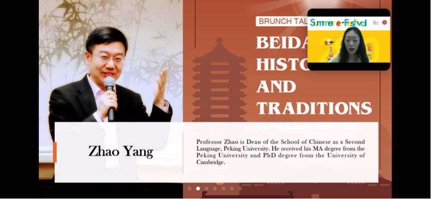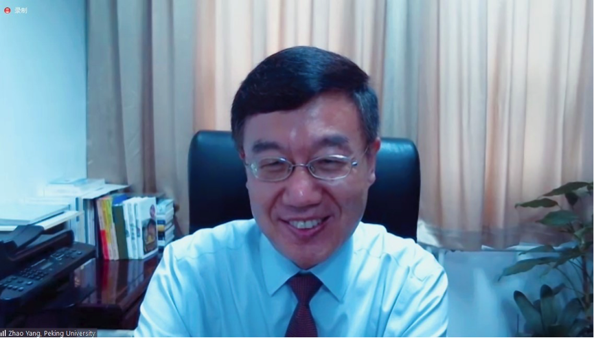 之后,北京大学对外汉语教育学院院长赵杨教授围绕“北京大学的历史与传统”主题进行线上讲座。赵杨老师以北大元素的文化象征开篇,将关系着这所古老学堂变迁与发展的历史人物和重要事件娓娓道来,带领同学们驶过时间的长河,体味燕园底蕴的厚重与绵长。随后的问答环节,赵杨教授用巧思和幽默回答同学提问,将讲座氛围推向高潮。妙趣横生的讲演和项目学生对北大的向往情怀热情交织。
