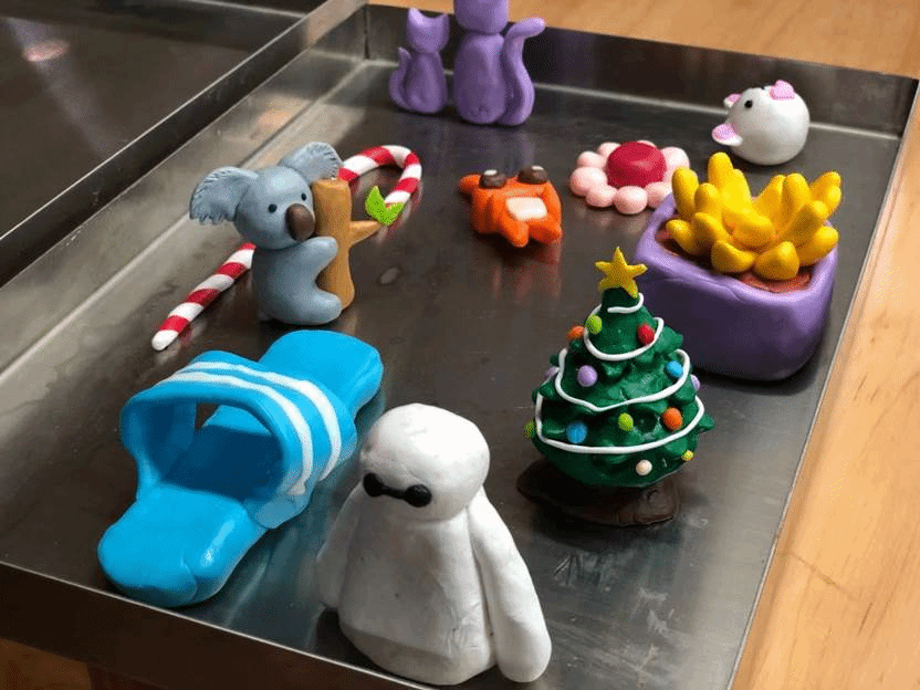 虽然很多同学都是第一次上手进行软陶制作,但技术上的困难并没有吓倒大家。在经过简探索后,大家确定了适合自己的创作方式,制作出自己独一无二的软陶作品。有的同学发动创意,将简单的图案连缀起来,设计出精巧可爱的造型。有的同学独出心裁,用软陶玩起来赛博风,好不威风。有的同学运用巧手,充分利用原料和工具,创作出独特的圣诞套装。