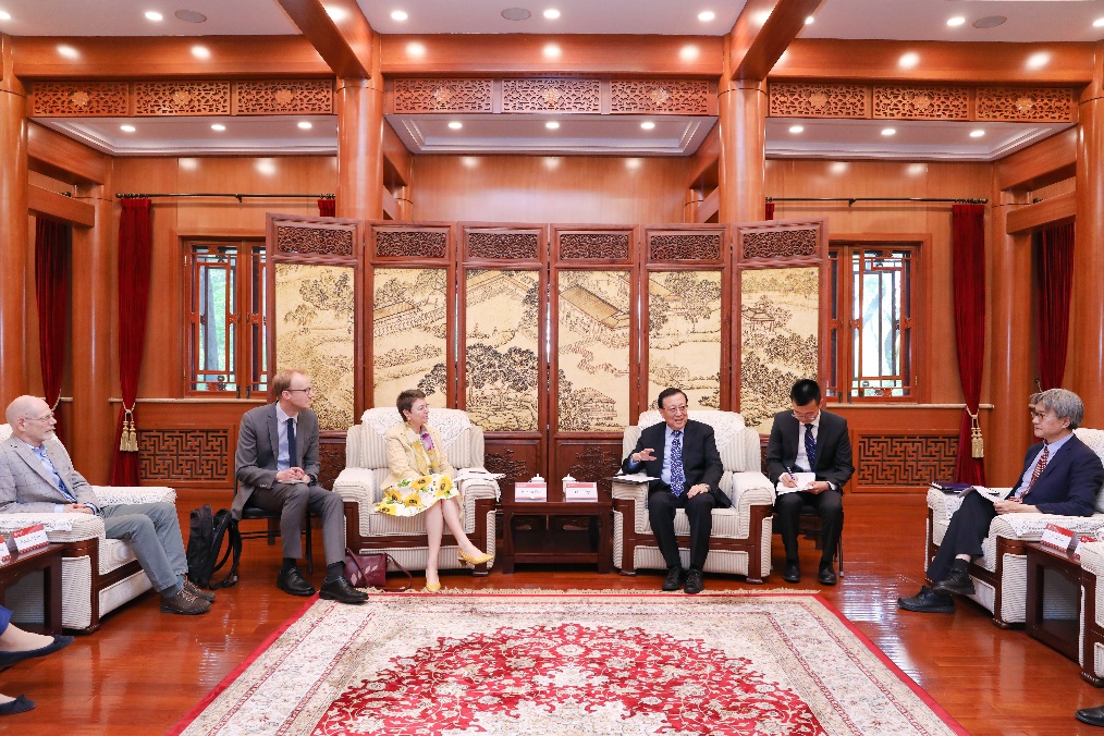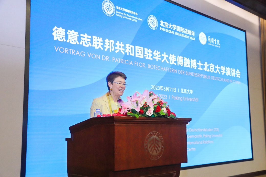 2023年5月11日下午,德国驻华大使傅融(Dr. Patricia Flor)博士一行访问北京大学并发表演讲。北京大学党委书记、校务委员会主任郝平,副校长、教务长王博在临湖轩中厅会见了傅融一行。