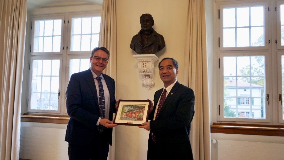 10月23日,北京大学代表团访问苏黎世大学,与校长迈克尔·埃勒特·沙普曼(Michael EllertSchaepman)等交流座谈。龚旗煌表示,北京大学高度重视与苏黎世大学的合作与交流,双方在许多领域已建立深厚的合作基础,期待未来进一步拓展交流。沙普曼欢迎北大代表团一行,并介绍了苏黎世大学的发展情况。双方就推进更宽领域的合作交换了意见。
