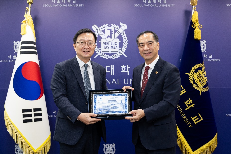 在首尔国立大学,龚旗煌与校长柳弘林展开了亲切交流。龚旗煌表示,两校交流基础深厚,他期待今后双方不断拓展新的合作领域。柳弘林表示,首尔国立大学愿与北大就气候变化、能源环境、公共健康等人类共同挑战开展更多合作。