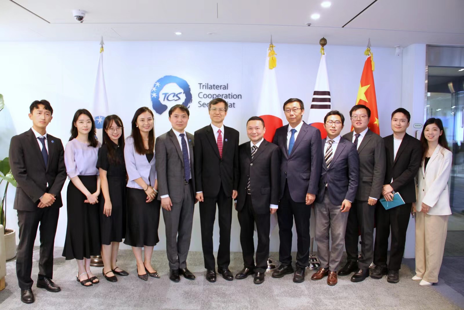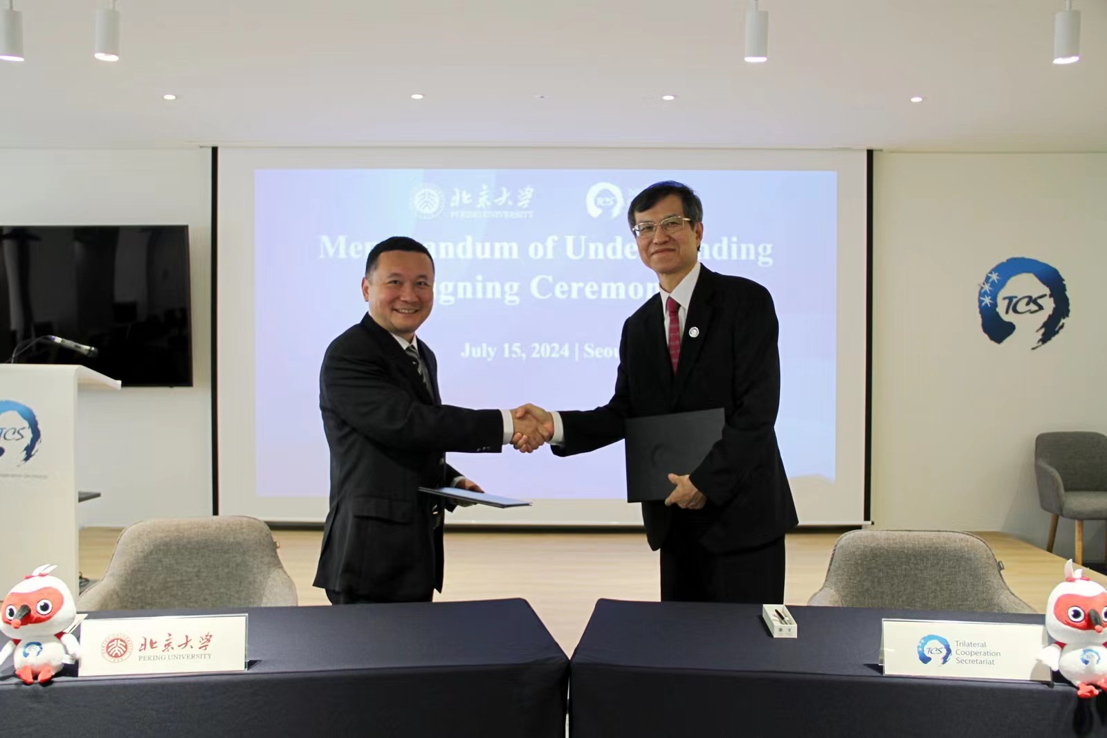 7月15日上午,代表团访问位于韩国首尔的中日韩合作秘书处,秘书长李熙燮热情接待了代表团一行。任羽中汇报了北大参与“亚洲校园”项目的有关情况,对秘书处多年来对北大的大力支持表示感谢,期待在新的阶段开启更加深入的交流与合作,为实现三国领导人确定的到2030年将“亚洲校园”参与人数增至3万人目标作出贡献。李熙燮对代表团的来访表示热烈欢迎,希望未来与北大在国际组织实习等领域开展更加密切合作,为中日韩三国人文交流提供更多助力。会见结束后,任羽中和李熙燮代表双方签署谅解备忘录,以推动支持包括“亚洲校园”在内的青年交流项目。此外,代表团还分别会见了中方副秘书长颜亮和日方副秘书长图师执二,两位副秘书长对秘书处与北大未来合作提出了宝贵意见。