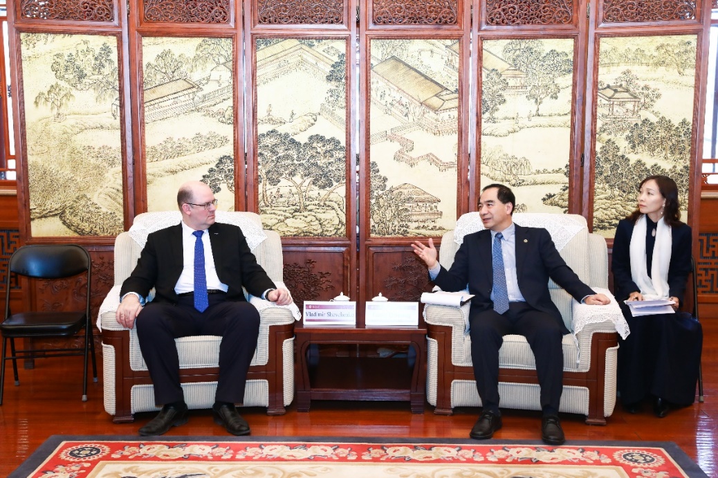 2月13日下午,俄罗斯国立核能研究大学-莫斯科工程物理学院(MEPhI)(简称莫斯科工程物理学院)院长弗拉基米尔·舍甫琴科(Vladimir Shevchenko)、副院长德米特里·萨夫金(Dmitriy Savkin)、副院长尼古拉・卡尔金(Nikolai Kargin)访问北京大学。北京大学校长龚旗煌在临湖轩会见来宾,党委常委、副校长方方陪同会见。