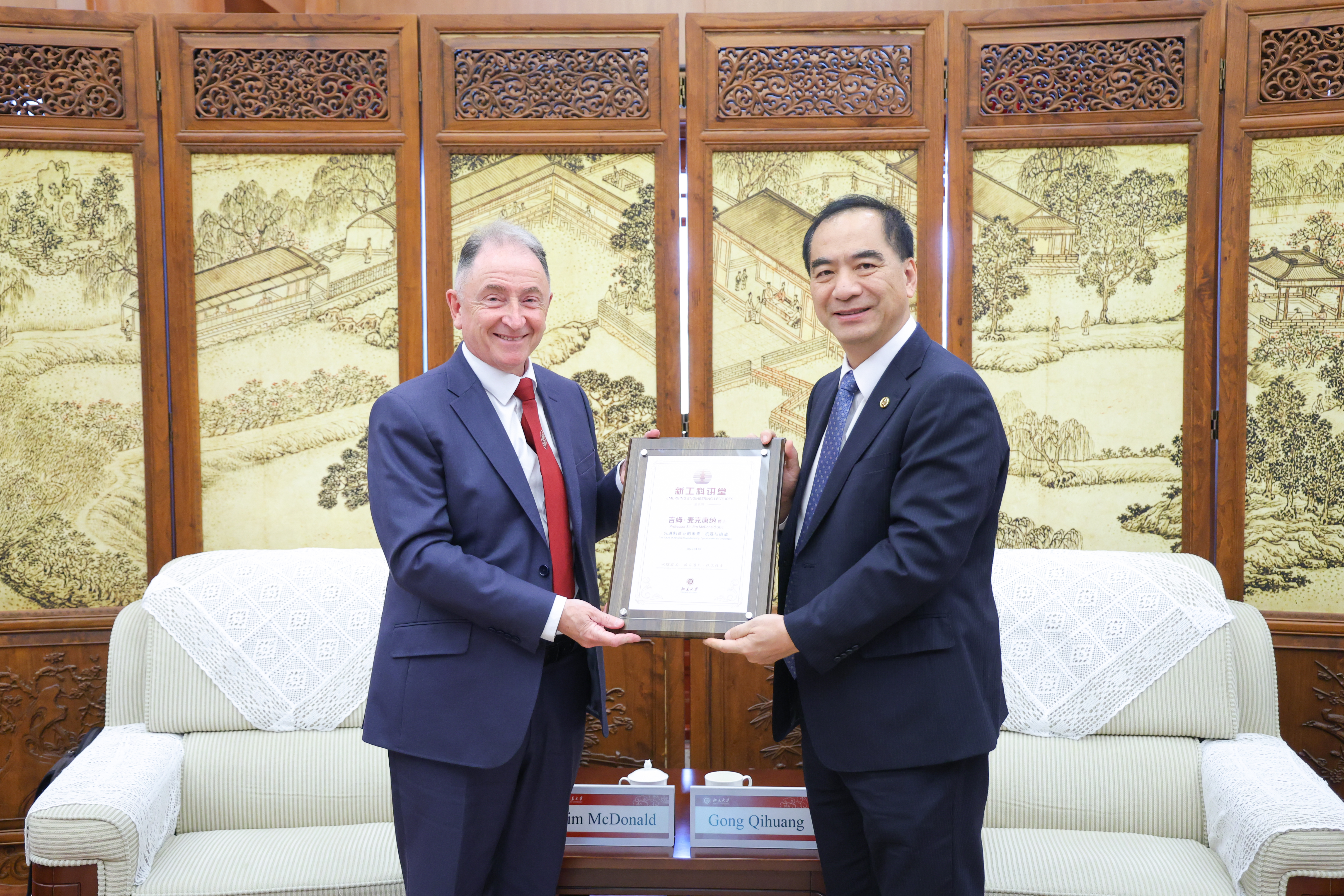 龚旗煌对麦克唐纳的再次到访表示欢迎,并感谢其长期以来推动两校合作、促进中英科技教育交流的重要贡献。近年来,双方围绕“双碳”战略、可持续发展及汉语教学等重点领域开展了务实合作,取得丰硕成果。当前,北京大学正加快推进学科构建与科技创新,重点布局人工智能、先进材料、能源与环境等前沿领域,期待在新工科建设、高层次人才培养、联合科研创新等方面与思克莱德大学深化战略协同,进一步拓宽合作领域,为中英学术交流和全球知识创新贡献更多成果。