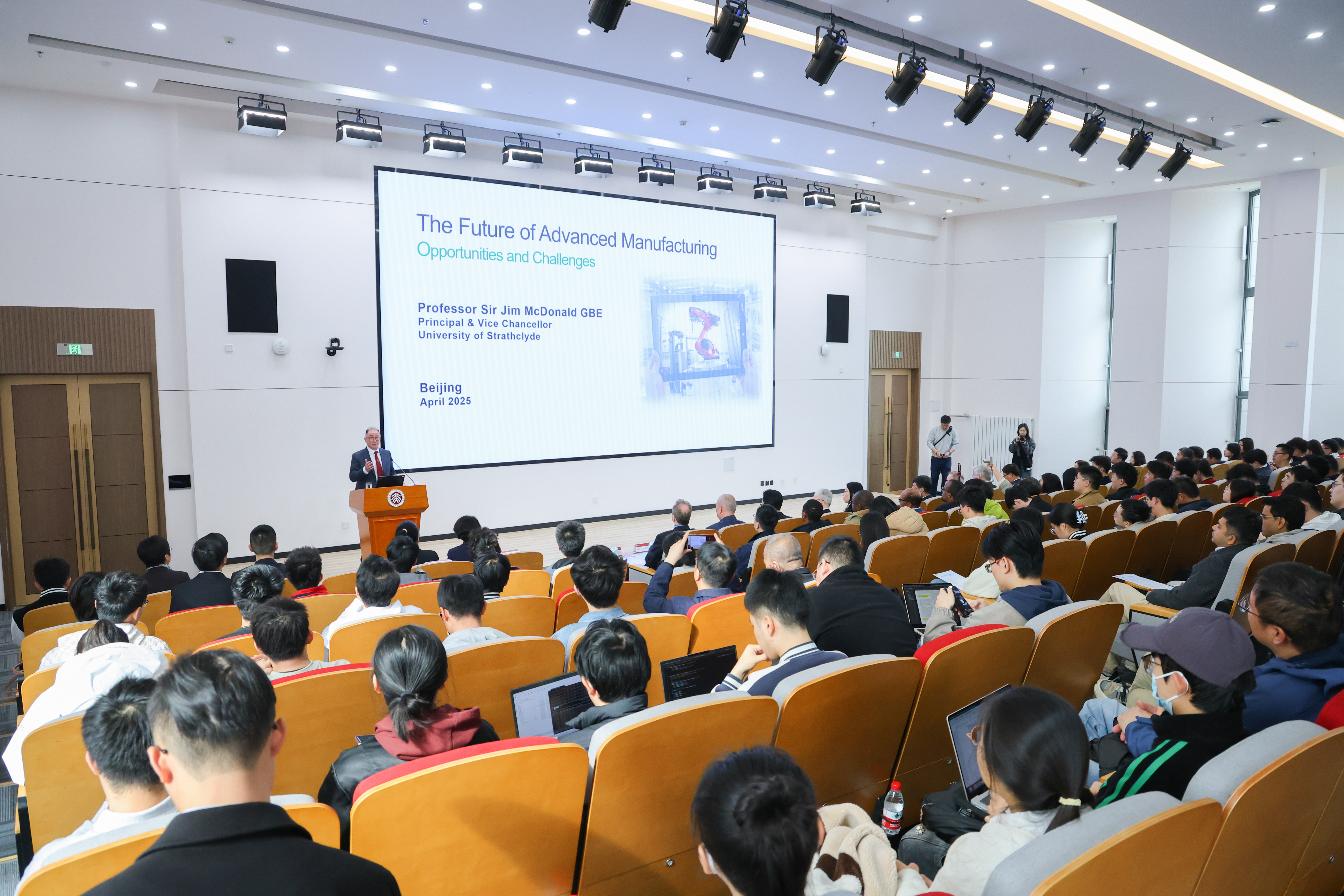 当天,麦克唐纳以“先进制造业的未来:机遇与挑战”为题,主讲第八期“北大新工科讲堂”。他结合思克莱德大学在工业4.0至5.0转型中的研究实践,系统阐述了智能制造、可持续工程、数字技术融合等关键技术的演进趋势与应用前景,深入探讨了产业变革对工程教育与创新体系的挑战与机遇。