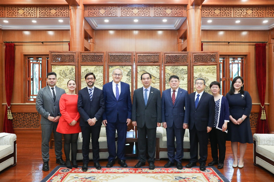 2025年5月19日上午,墨西哥驻华大使施雅德(Jesús Seade Kuri)一行访问北京大学。北京大学校长龚旗煌在临湖轩会见来宾,党委常委、副校长董志勇陪同会见。
