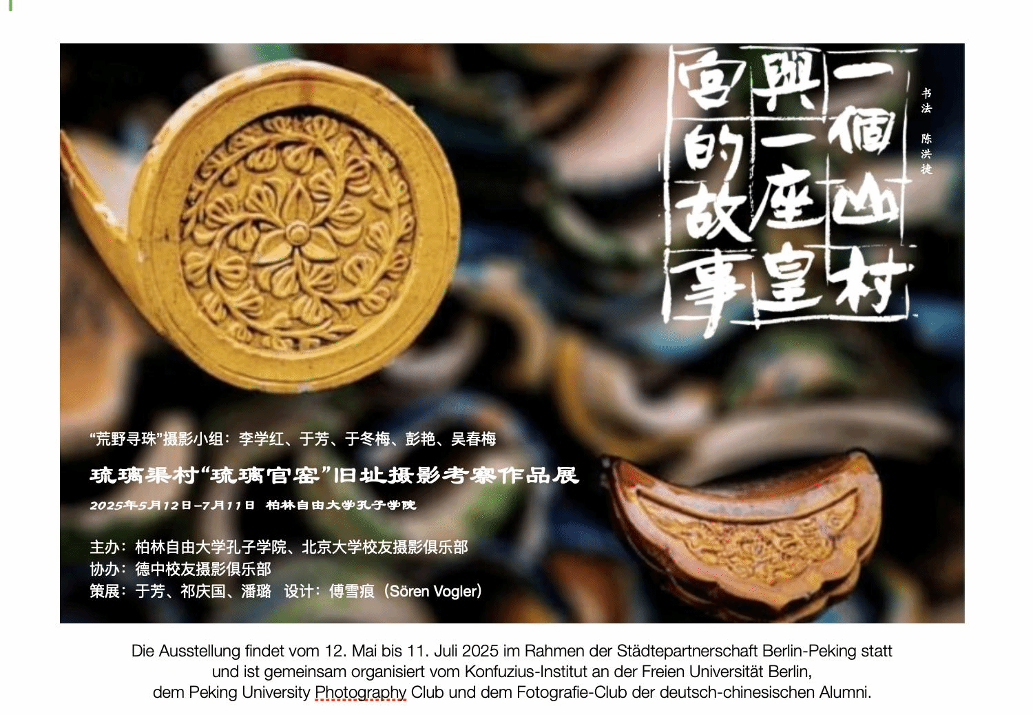 柏林当地时间2025年5月12日,为庆祝柏林与北京缔结友好城市关系三十周年,《一个山村与一座皇宫的故事——琉璃渠村“琉璃官窑”旧址摄影考察作品展》摄影展在柏林自由大学孔子学院揭幕。本次展览由柏林自由大学孔子学院与北京大学校友摄影俱乐部联合主办,德中校友摄影俱乐部协办,旨在通过影像语言,展现北京中轴线与京西琉璃渠村之间鲜为人知的历史纽带,并讲述民间力量自发守护中华文化遗产的动人篇章。
