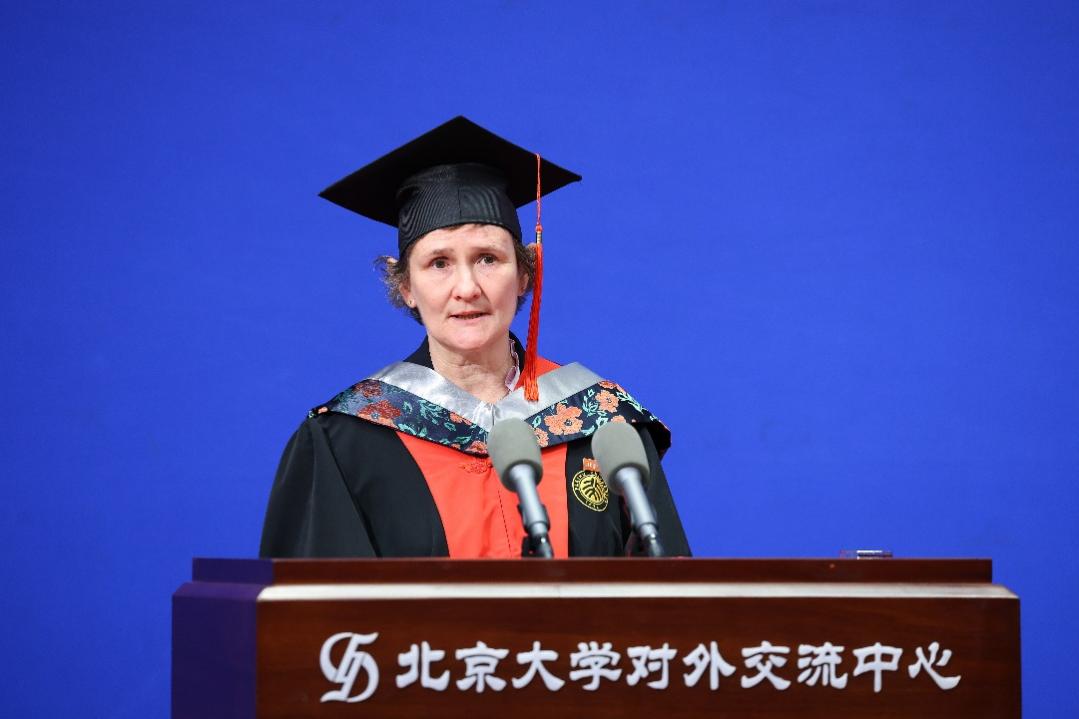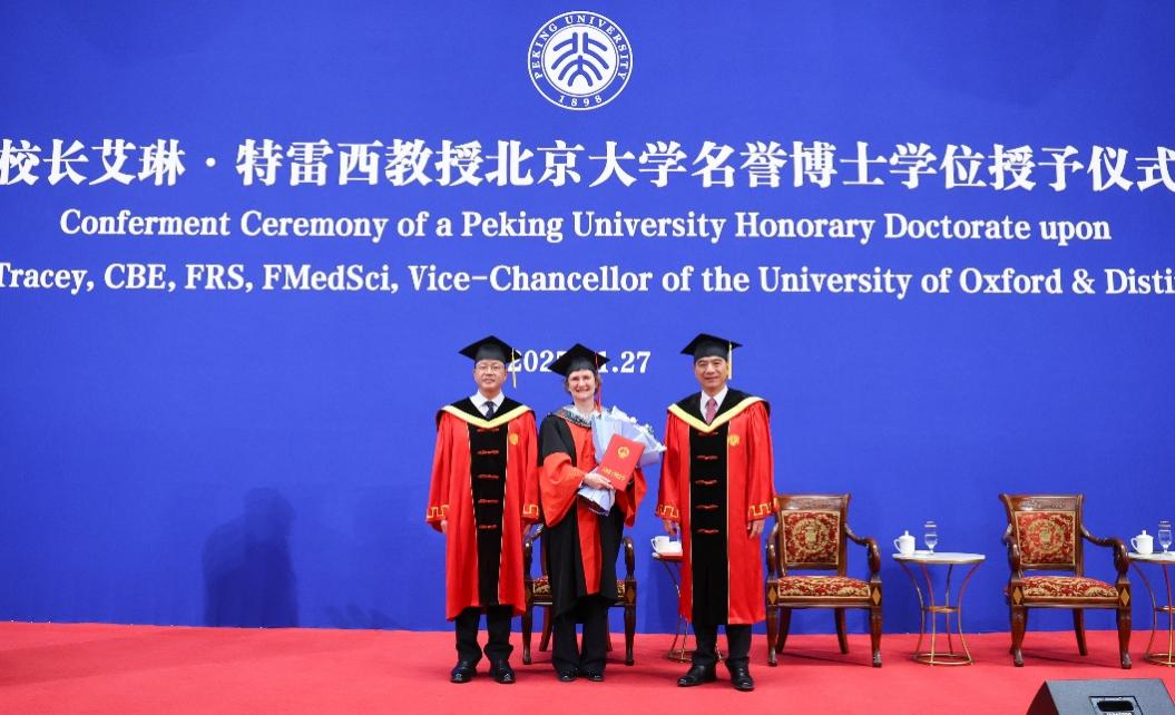特雷西对北京大学授予其名誉博士学位表示衷心感谢,并高度评价两校长期合作所取得的丰硕成果。她表示,牛津大学始终将北京大学视为重要伙伴,两校虽相距万里,但在探索知识、服务社会方面理念一致。未来,牛津大学愿与北京大学继续加强合作,在人才培养、科学研究等方面携手应对全球性挑战,共同为世界的和平与发展贡献力量。