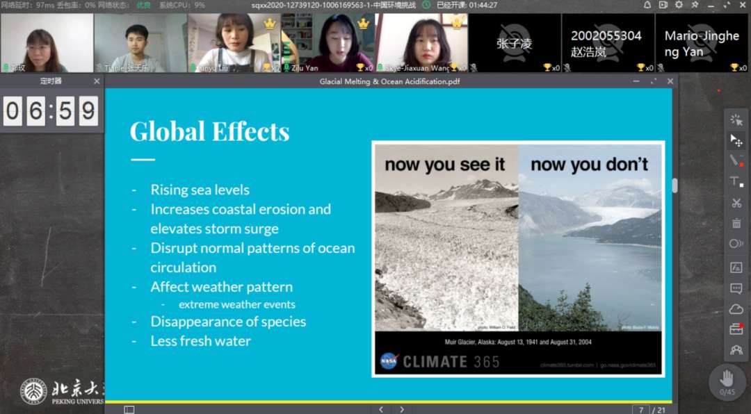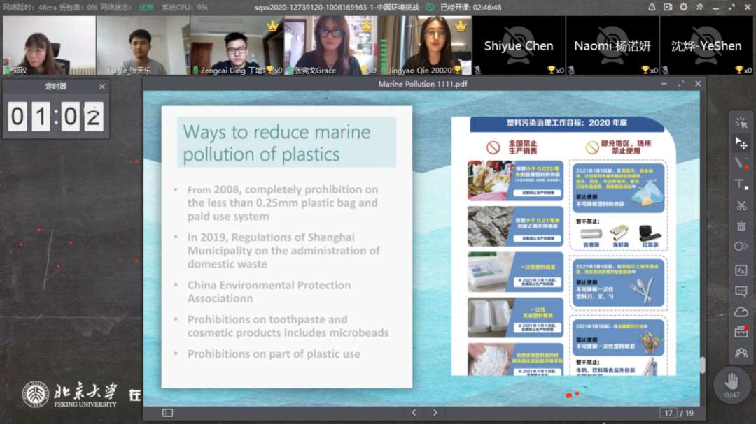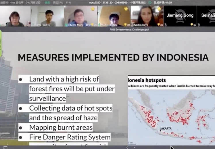 课上,50多名同学云端相聚。他们虽然来自各个国家不同专业,但是对于环境问题的思考和责任心都是一样的深入热忱。每一个问题,他们积极讨论,见解独立。他们不仅对自己国家的环境问题和政策十分关心,并且对于中国等国的现状与治理手段产生很大的求知欲。其中部分学生表达了未来到中国工作的愿望,希望在这一堂课里面收获与环境相关的各种信息。