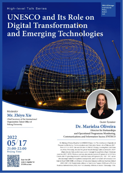 2022年5月17日晚,联合国教科文组织通信及信息部门伙伴关系及业务计划监测主任欧敏行(Marielza Oliveira)应邀作为北大-芝大联合系列讲座、北大-芝大国际政策暑期项目高端讲座嘉宾,围绕“联合国教科文组织及其在数字转型和新兴技术方面的作用”主题做在线分享。