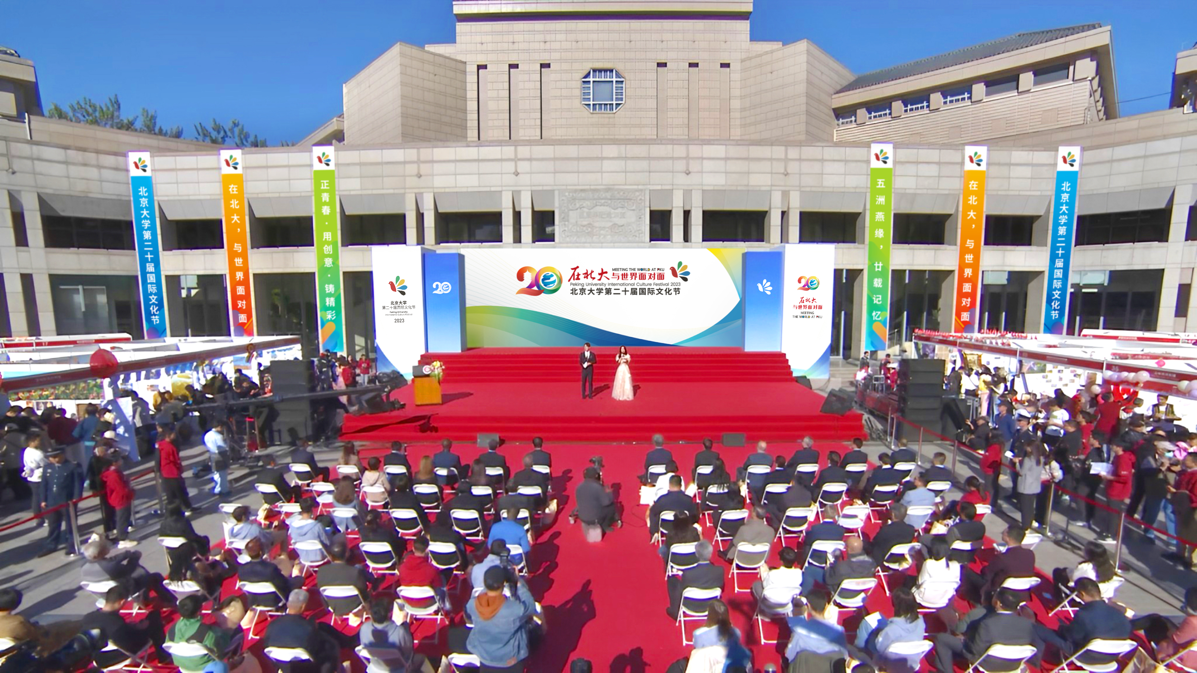 2023年10月21日上午,北京大学第二十届国际文化节在百周年纪念讲堂广场开幕。本届文化节以“在北大,与世界面对面”为主题,共有100多个国家和地区的中外学生参与其中。五彩为羽振翅飞,交流互鉴传妙音。走过20个春秋,北京大学国际文化节凝聚着世界文化的多姿多彩,见证着国际交流合作的生生不息。开幕式现场国际文化节期间,校党委书记郝平、校长龚旗煌来到现场,参加主题游园会活动,饶有兴致地观看留学生才艺表演,与各展台...