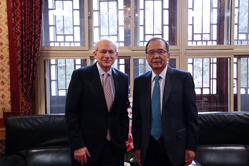 北京大学校长林建华在校长办公室会见了美国莱斯大学校长戴维•勒布朗(David Leebron),以及院长夫人孙月萍(Y. Ping Sun)和校长特别顾问戴维•瓦瑟(David Vassar)一行三人...
