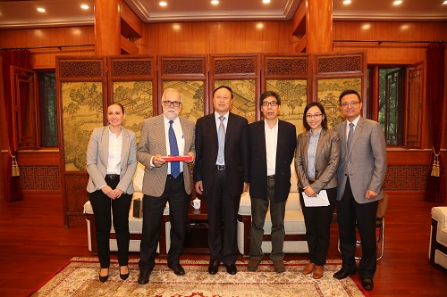 刚刚卸任墨西哥学院院长的加西迭亚戈博士访问我校,北京大学党委书记朱善璐、拉美研究中心主任董经胜、国际合作部部长夏红卫等在临湖轩中厅接待了来宾一行。